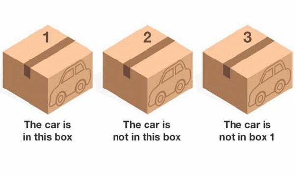 と書かれています。これらのヒントからあなたは車が何番の箱に入っているか推測できますか? そして前提条件として、この3つのヒントのうち1つだけが真実を言っています。